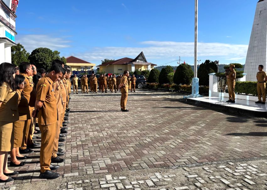 TAPUT, DELITIMES.ID – Bupati Tapanuli Utara Dr Jonius Taripar Parsaoran Hutabarat memimpin apel pagi gabungan di lingkungan Pemkab Taput, di halaman kantor bupati, Tarutung, Senin (16/3/2026).