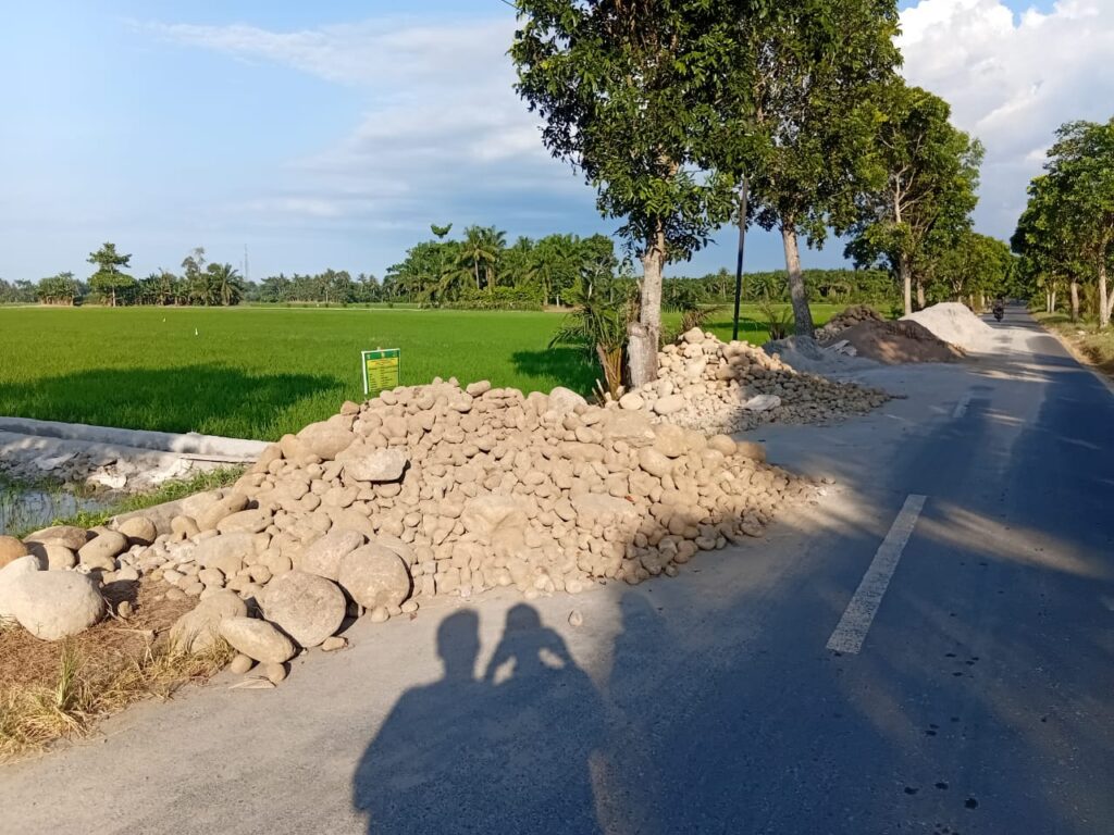 Selain itu, ia menilai pekerjaan proyek tersebut kurang “Beres” dan terkesan asal-asalan saja sehingga batu sama pasir dibiarkan aja bertumpukan sampai memakan badan jalan.