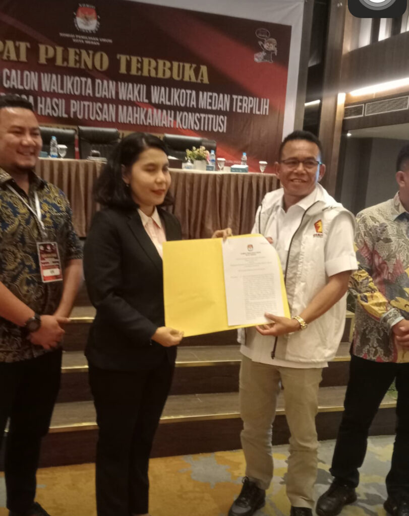 Keputusan itu dibacakan oleh Ketua KPU Medan, Mutia Atiqah pada Rapat Pleno Terbuka Penetapan Pasangan Calon Wali Kota dan Wakil Wali Kota Medan Tahun 2024 Pasca Putusan Mahkamah Konstitusi yang digelar di Hotel Lee Polonia Medan, Rabu (5/2) malam.