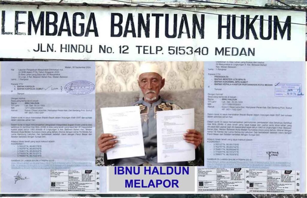 MEDAN, DELITOMES.ID – Laporan Ibnu Haldun (81) warga Desa Lama Hamparan Perak Deliserdang ke Presiden RI dan Kapolri atas puluhan hektar lahan milik nya dan puluahn warga lain yang dijadikan 22 Sertifikat Hak Milik (SHM) atasnama Orang Tak Dikenal oleh Kantor Pertanahan Kota Medan diduga Lembaga Bantuan Hukum (LBH) Medan sebagai praktek mafia tanah.