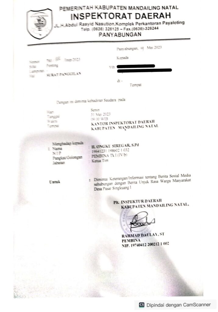 Informasi diperoleh, Selasa (30/5), surat panggilan ini untuk dimintai keterangan/informasi tentang berita sosial media sehubungan dengan berita unjukrasa warga masyarakat Desa Pasar Singkuang 1.