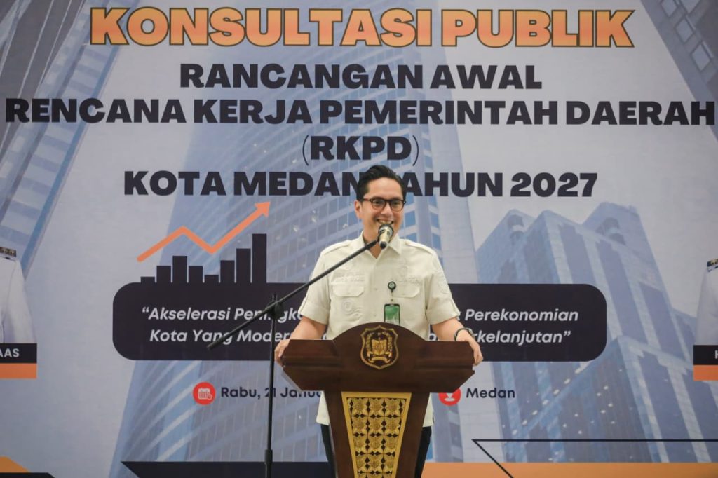 MEDAN, delitimes.id – Pemerintah Kota Medan menggelar Forum Konsultasi Publik Rancangan Awal Rencana Kerja Pemerintah Daerah (RKPD) Kota Medan Tahun 2027 di Hotel Arya Duta, Rabu (21/1/2026). Forum ini dibuka langsung oleh Wali Kota Medan Rico Tri Putra Bayu Waas dan dihadiri unsur pemerintah, DPRD, akademisi, pelaku usaha, serta tokoh masyarakat.