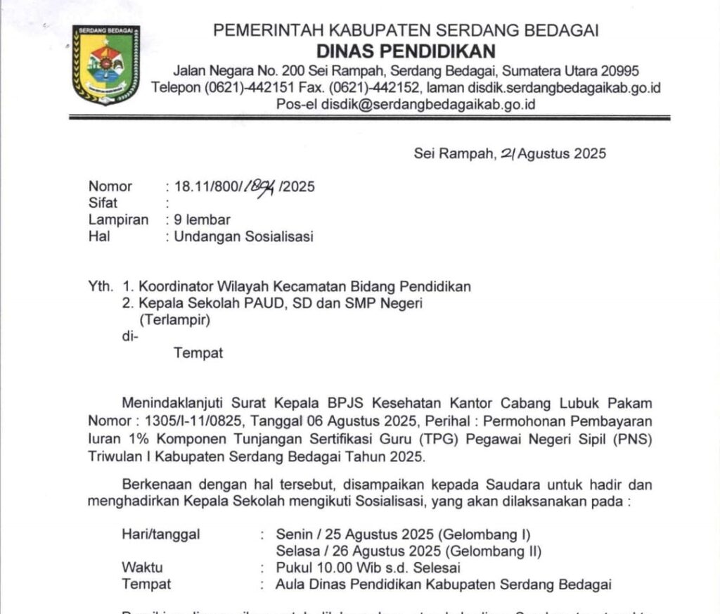 SERGAI||DELITIMES.ID|| – Semua guru Pegawai Negeri Sipil (PNS) dan guru yang telah diangkat menjadi Pegawai Pemerintah dengan Perjanjian Kerja (PPPK), Kepala sekolah PAUD,SD,SMP Negeri dan Korwil Kecamatan Bidang Pendidikan, yang bertugas tersebar di Kabupaten Serdang Bedagai (Sergai), Sumatera Utara (Sumut), akan dikumpulkan untuk mengikuti dan mendengarkan penjelasan kegiatan sosialisasi BPJS Kesehatan dari Kantor Cabang Lubuk Pakam Kabupaten Deli Serdang, tentang pembayaran iuran sebesar 1 persen yang diambil dari TPG (Tunjangan Profesi Guru) Triwulan I tahun 2025.