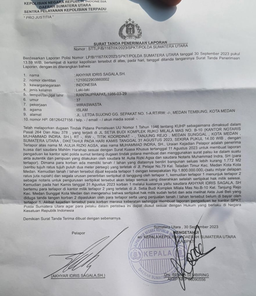 Mengetahui hal tersebut korban merasa keberatan sehingga melaporkan M Aulia Rizki Agsa dan notaris Muhammad Indra SH ke Polda Sumut.