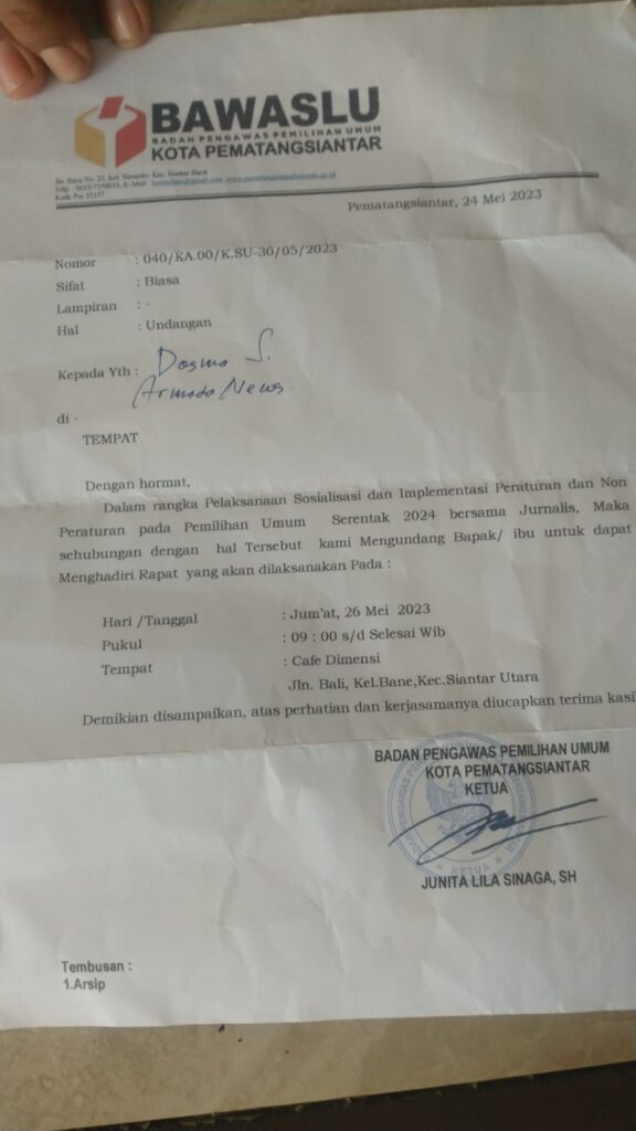 PEMATANG SIANTAR, DELITIMES.ID – Badan pengawasan pemilihan umum (Bawaslu) Kota Pematangsiantar ‘mengusir’ Sekretaris Serikat Media Siber Indonesia (SMSI) Siantar-Simalungun, Dosmaria Saragih, dari acara sosialisasi soal pelaksanaan dan implementasi peraturan pada Pemilu 2024.