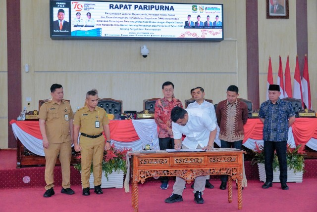 Persetujuan tersebut diambil pada sidang paripurna DPRD Kota Medan, yang dipimpin Ketua DPRD Medan, Hasyim, S.E., didampingi Wakil Ketua, Ihwan Ritonga dan T. Bahrumsyah dan turut dihadiri Wali Kota Medan Bobby Nasution, serta para pimpinan OPD Pemko Medan di DPRD Medan, Senin (9/9).