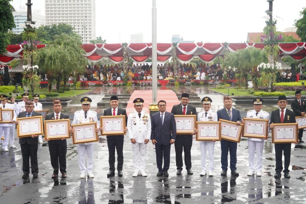 SURABAYA, DELITIMES.ID – Wali Kota Medan Bobby Nasution menerima Anugerah Tanda Kehormatan Satyalancana Karya Bhakti Praja Nugraha dari Presiden Republik Indonesia Joko Widodo, yang diserahkan Menteri Dalam Negeri (Mendagri), Tito Karnavian pada puncak peringatan Hari Otonomi Daerah (Otda) XXVI di Balai Kota Surabaya, Kamis (25/4).